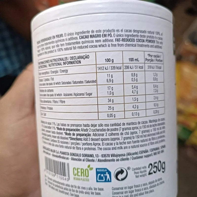 Valor – Cacao Puro Natural 100% Soluble Sans Gluten Sans Sucre 250g
